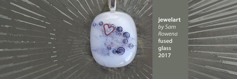 I love the iridescent and sparkly bubbles and add a powder to help create them. They also partly form due to the air that is trapped inside the glass layers whilst the pieces are being fused. Elements of different heights have more potential to trap air and a complete wire shape will trap more air inside it. This is why there is a bubble inside the wire heart shapes in my jewelart heart design fused glass pendants.